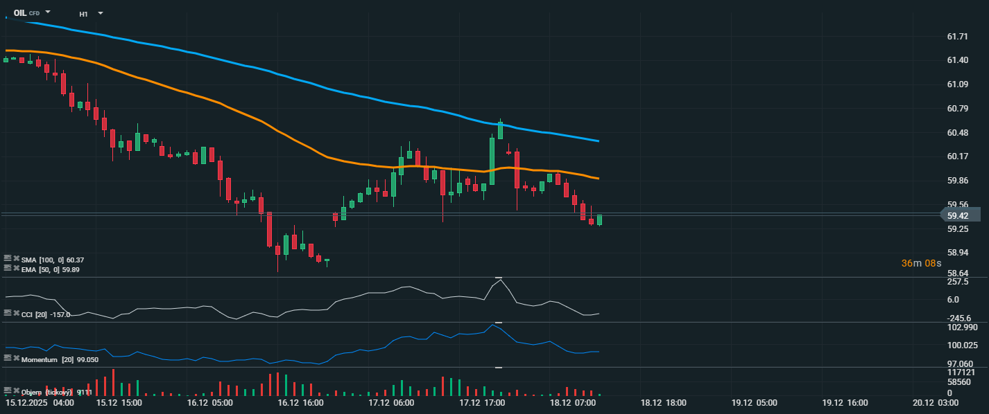 Z technického hľadiska je aktuálne kľúčová podpora v pásme 58,90–59,00 USD, ktorej prielom by mohol otvoriť priestor na ďalší pokles až k úrovniam okolo 58,20 USD. Naopak, návrat k rastu by si vyžadoval prelomenie oblasti nad 60 USD, kde sa nachádza aj SMA 100.