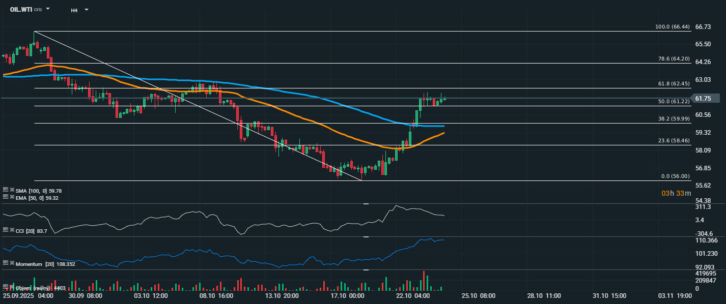 Z pohľadu Fibonacciho úrovní predstavuje ďalšiu dôležitú rezistenciu úroveň 63,03 USD (61,8 %) a následne 64,26 USD (78,6 %). Udržanie ceny nad 61,22 USD je kľúčové pre zachovanie aktuálneho býčieho scenára. Naopak, najbližšia podpora sa nachádza v pásme 59,30–59,78 USD, teda v zóne prelomených kĺzavých priemerov.