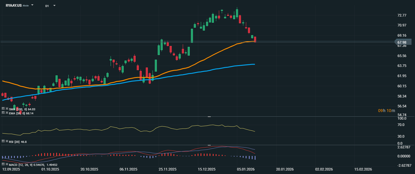 Akcie Ryanairu v posledných dňoch oslabili a aktuálne sa obchodujú na úrovni 67,98 USD, kde testujú kľúčovú podporu v podobe EMA 50 (68,14 USD). Cena je pod miernym tlakom po sérii klesajúcich sviečok, no pásmo 67,50–68,50 USD môže slúžiť ako dôležitá zóna obratu. RSI klesol na 46,8, čo naznačuje slabnúce momentum, no zatiaľ neukazuje známky prepredanosti.