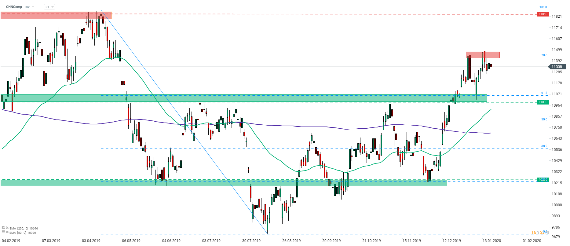 Navzdory čínskému makru dnes CHNComp mírně klesá. Index si neví rady s resistencí na 78,6 % fibo (11 425b). Zdroj: xStation5