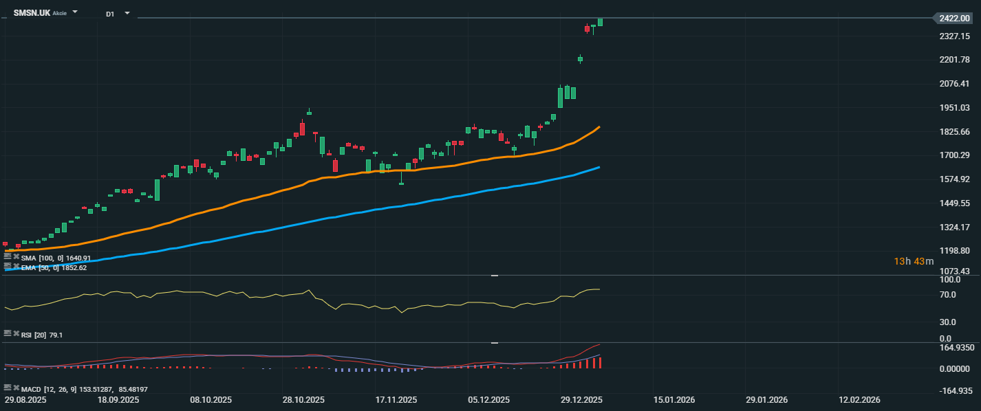 Akcie spoločnosti Samsung Electronics pokračujú v prudkom raste a aktuálne dosiahli nové maximum na úrovni 2 422 GBP. Tento pohyb nadväzuje na silný býčí trend, ktorý začal koncom roka 2025, a odvtedy akcie vykazujú akcelerujúce tempo rastu. Cena sa drží výrazne nad kĺzavými priemermi – krátkodobým EMA 50 (1 852,62 GBP) aj dlhodobým SMA 100 (1 640,91 GBP), čo potvrdzuje extrémne silné technické momentum. RSI sa aktuálne nachádza na úrovni 79,1, teda v pásme prekúpenosti, čo upozorňuje na možnosť krátkodobej korekcie alebo spomalenia rastu. V silných trendoch však RSI môže zotrvať v prekúpenej zóne dlhší čas. Z technického hľadiska sa akcie nachádzajú v jasnom „breakout“ režime, kde sa obchodujú v nezmapovanom území bez predchádzajúcich rezistencií. Kľúčové bude sledovať, či sa rast udrží, alebo dôjde ku krátkodobému výberu ziskov.
