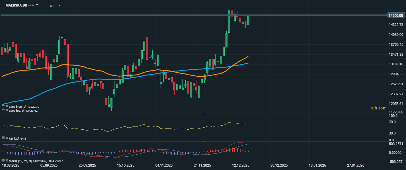 Akcie spoločnosti Maersk sa aktuálne obchodujú na úrovni 14 600 DKK, teda neďaleko od svojho nedávneho maxima. Akcie zaznamenali silný rastový trend koncom novembra, keď prerazili nad oba kľúčové kĺzavé priemery – EMA 50 (13 420 DKK) a SMA 100 (13 223 DKK) – a tento pohyb bol sprevádzaný silným býčím momentom. RSI sa nachádza na úrovni 64,8, teda tesne pod prekúpenou zónou, čo poukazuje na vysoký záujem kupcov, no zároveň priestor pre miernu konsolidáciu.