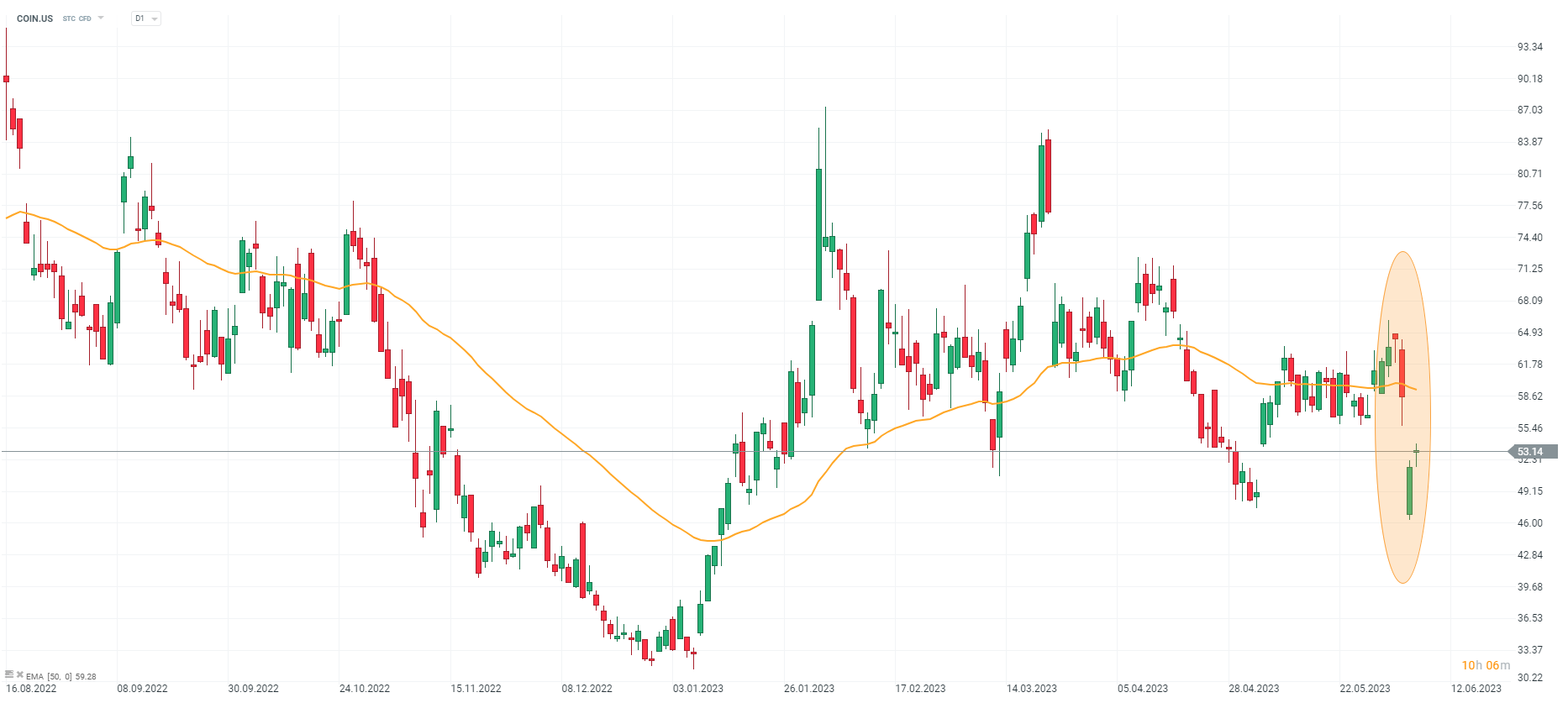 Akcie COIN.US odpísali 17% po oznámení žaloby. Zdroj: xStation5