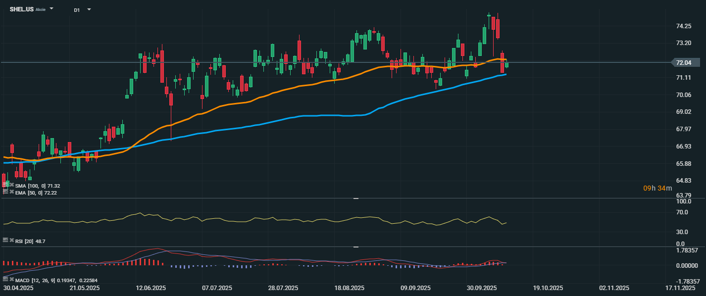 Cena akcií sa aktuálne nachádza na úrovni 72,04 USD, tesne nad SMA 100 (71,32 USD), pričom EMA 50 (72,22 USD) bola krátkodobo prerazená smerom nadol. RSI dosahuje hodnotu 48,7 a pohybuje sa v neutrálnej zóne, teda bez známok prekúpenia alebo prepredanosti. MACD je mierne negatívny, čo signalizuje potenciál pre ďalšie oslabenie, ak by nedošlo k odrazu späť nad EMA 50.