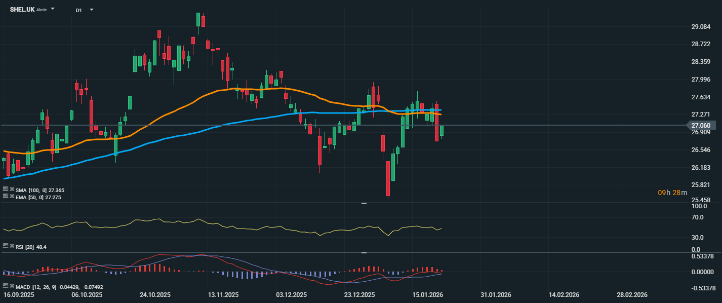 Akcie spoločnosti Shell sa aktuálne obchodujú na úrovni 27,06 GBP, teda tesne pod kĺzavými priemermi – EMA 50 (27,28 GBP) a SMA 100 (27,37 GBP). Táto zóna predstavuje krátkodobý odpor, ktorý cena opakovane testuje, no zatiaľ sa jej ho nepodarilo trvalo prekonať. RSI na úrovni 48,4 zostáva v neutrálnej zóne, čo signalizuje nízke momentum a absenciu extrémnych stavov (prepredanosti či prekúpenosti). Z grafu je zrejmé, že úroveň okolo 27,30 GBP predstavuje silnú technickú bariéru, ktorá oddeľuje možný návrat k rastovému trendu od pokračujúcej stagnácie či korekcie. Naopak, krátkodobú podporu možno sledovať v pásme 26,55–26,70 GBP – jej prelomenie by mohlo viesť k ďalšiemu poklesu.