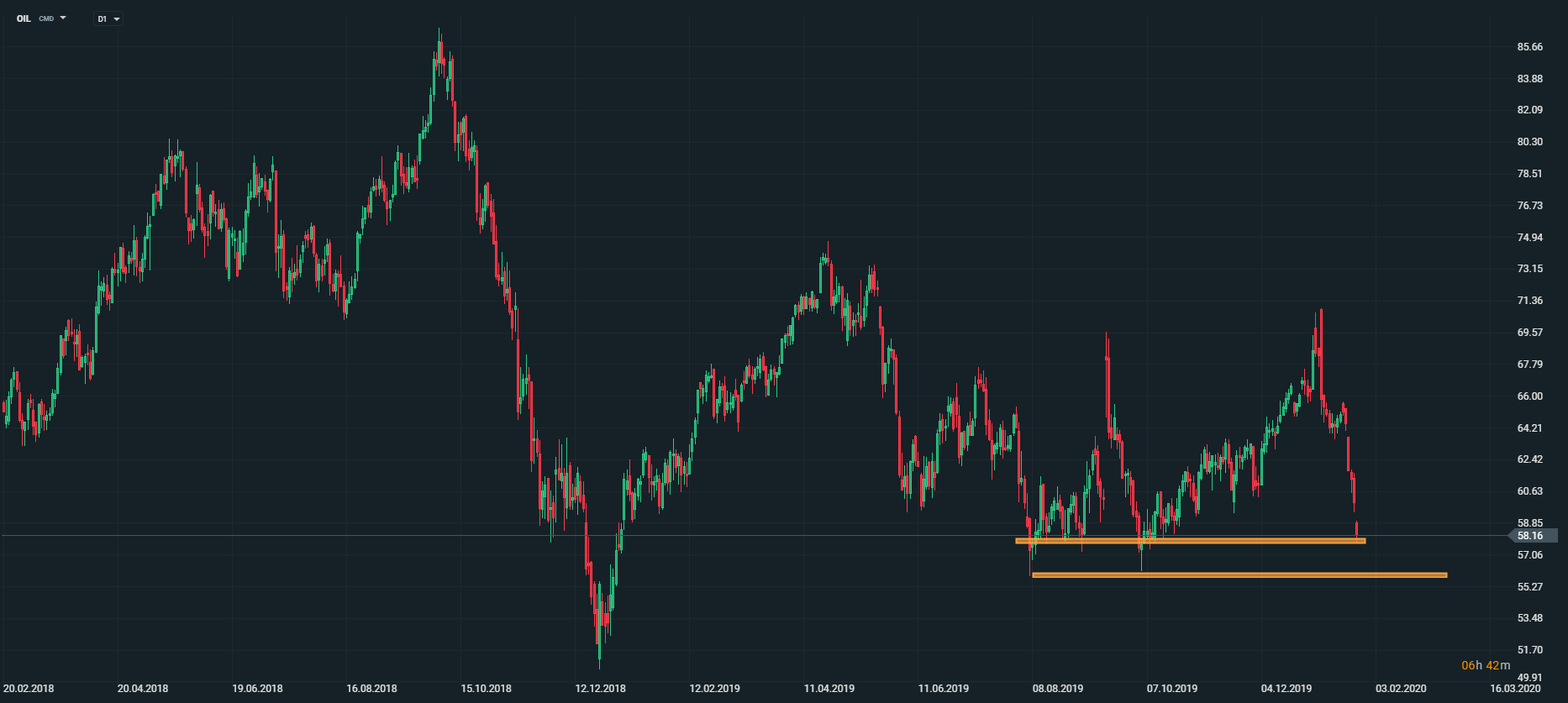 Cena ropy v súčasnosti testuje support na úrovni 58USD/bbl. V prípade, ak dokáže uzavrieť denná sviečka pod spomínanou úrovňou supportu, otvorí sa priestor na pokles k hladine 56USD/bbl. Zdroj: xStation5