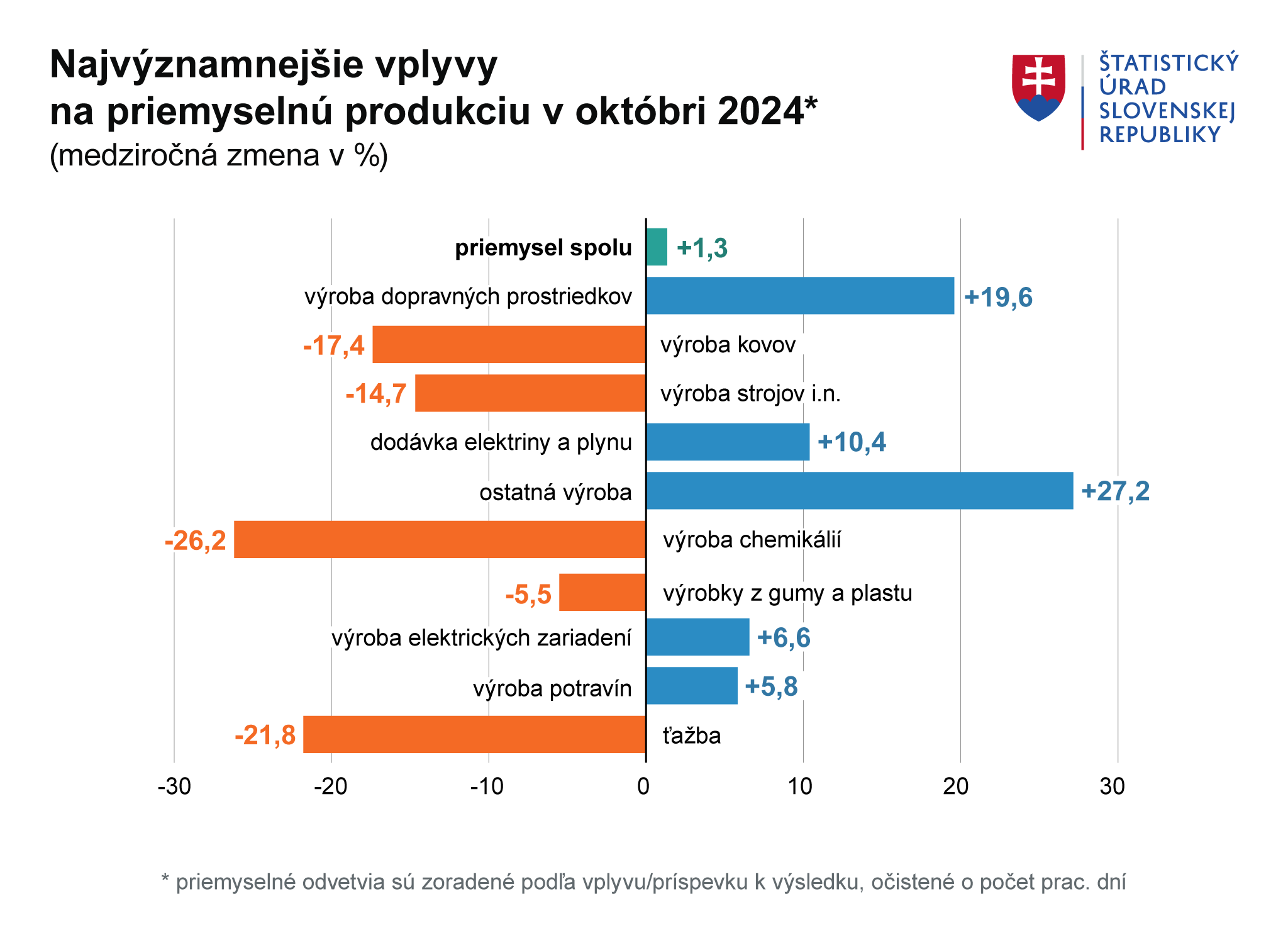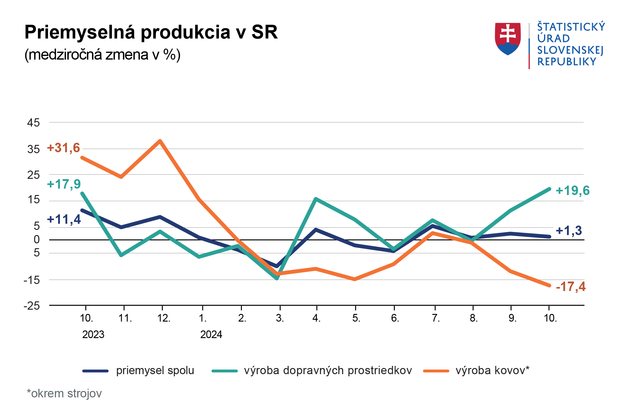 Rast priemyselnej produkcie na Slovensku pokračoval aj v októbri 2024, no tempo medziročného rastu sa spomalilo na 1,3 %. Pozitívny výsledok ťahala najmä výroba automobilov, ktorá medziročne vzrástla o takmer 20 %, čo predstavovalo príspevok 4,69 percentuálneho bodu. Naopak, výrazné poklesy vo výrobe kovov (-17 %) a strojov (-15 %) brzdili celkový rast.