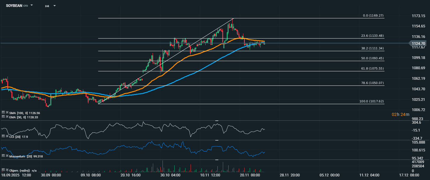 Ceny sójových bôbov vykazujú stabilizáciu v úzkom pásme po predchádzajúcom raste a následnej korekcii z lokálneho maxima na úrovni 1169,27 USD. Aktuálne sa obchodujú na cene 1124,70 USD, čo je mierne pod kĺzavým priemerom EMA 50 (1128,33 USD) a tesne pod SMA 100 (1126,56 USD). Táto situácia ukazuje na nerozhodnosť trhu a absenciu silného smeru.