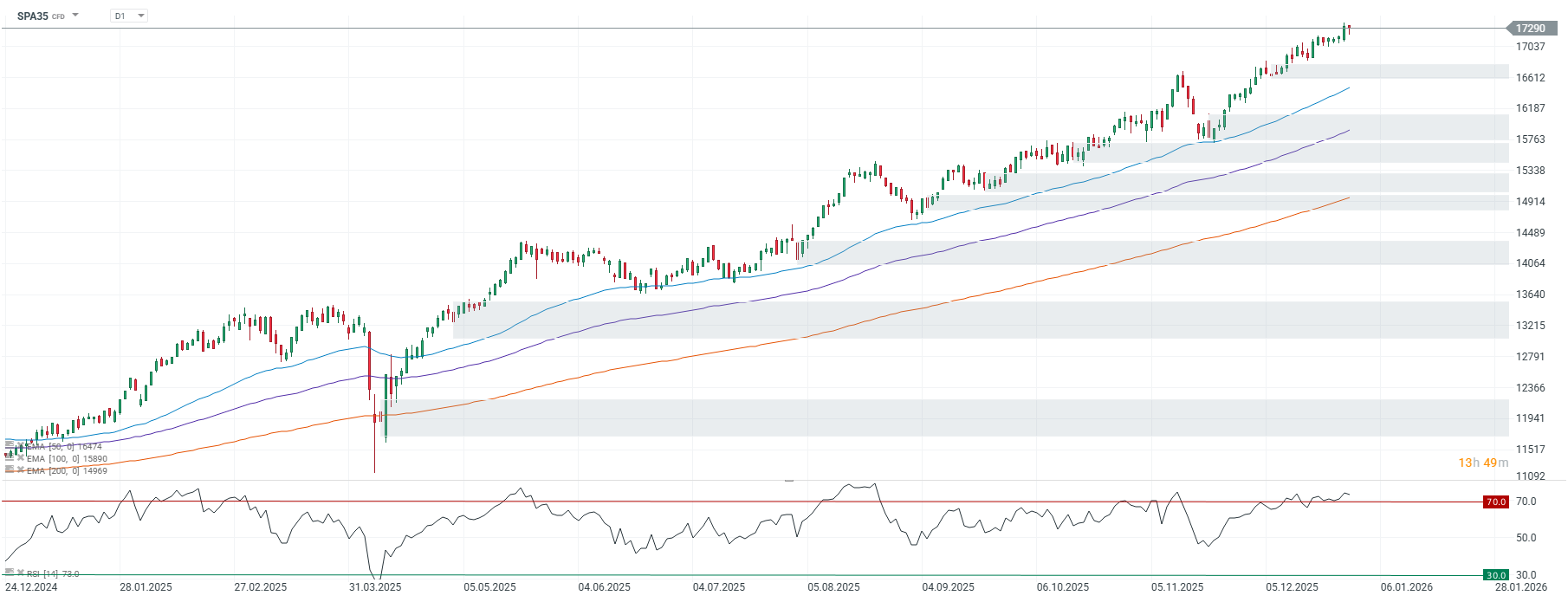 Španielske akcie smerujú k najlepšiemu roku od začiatku 90. rokov. Index Ibex 35 bol k utorkovému uzavretiu v plusu približne 50 %, čo by bol najsilnejší ročný výkon za 32 rokov a zároveň najlepší výsledok medzi hlavnými európskymi trhmi. Stratégovia navyše naďalej vidia priestor na rast vďaka zlepšujúcemu sa výhľadu ziskov.