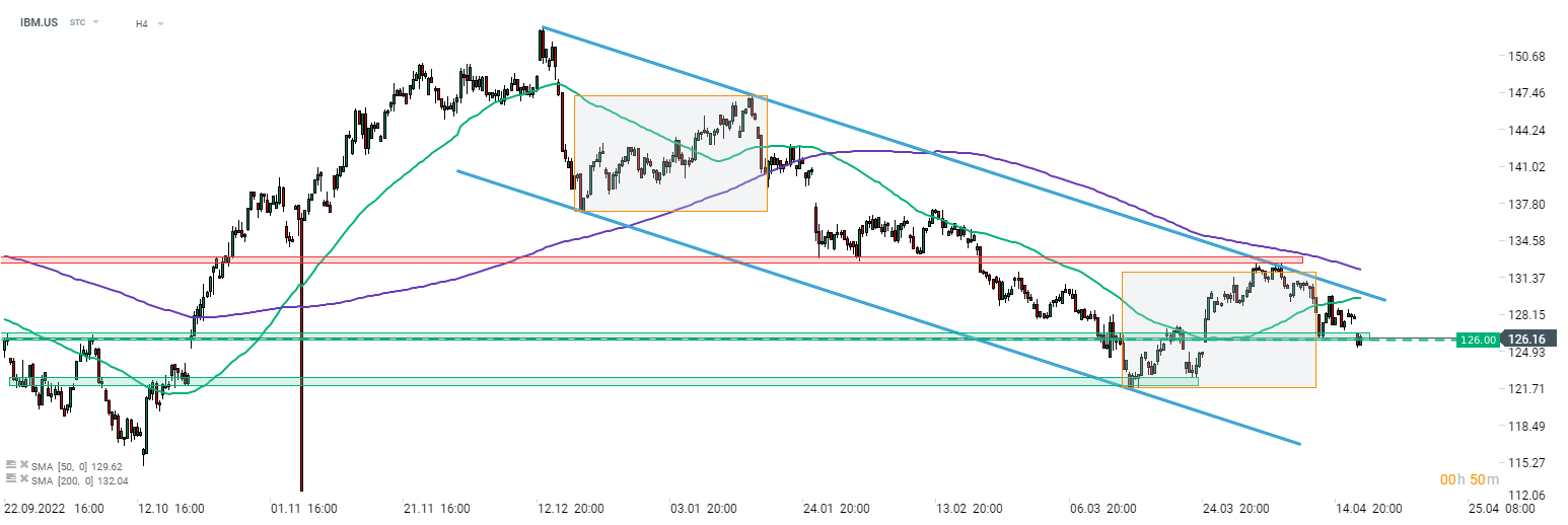 Podíváme-li se na graf společnosti IBM (IBM.US) v intervalu H4, vidíme, že cena akcie se v poslední době potýká s problémy a obchoduje se v medvědím cenovém kanálu. Ceně akcie se minulý týden na konci prvního dubnového týdne nepodařilo prorazit nad horní hranici kanálu a od té doby se pomalu stahuje zpět. Akcie se pokouší prorazit pod oblast podpory 126,00 USD. Proražení níže by otevřelo cestu k hlubšímu poklesu, přičemž potenciálním cílem by byla spodní hranice kanálu, která se v současnosti nachází v oblasti 115 USD. Vzhledem k tomu, že zveřejňování výsledků hospodaření má však tendenci vyvolávat velké pohyby, může se technický výhled změnit poté, co akcie zareagují na finanční výsledky za 1. čtvrtletí.