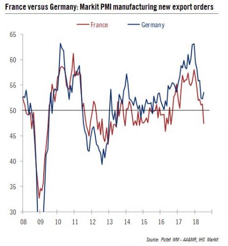 Vrátim sa ešte k tým priemyselným objednávkam. A to najmä k tým exportným. Aj napriek ďalšiemu spomaleniu síce ostávajú v pluse, vo veľkej miere je to však vďaka Nemecku. Vo Francúzsku sa už dostali do mínusu. Vracia sa do eurozóny fragmentácia? Na to je ešte skoro odpovedať, každopádne určité riziko tu je a budem to v najbližších mesiacoch sledovať.