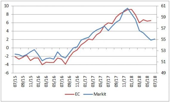 Vývoj indexov výrobnej dôvery od Markit Economics a Európskej Komisie