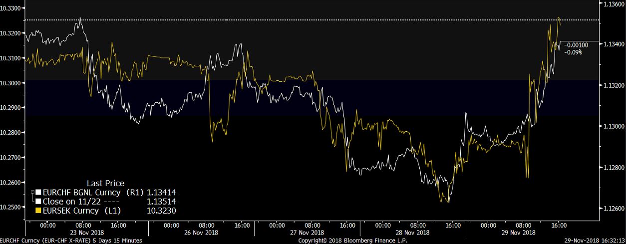 Vývoj EURCHF a EURSEK za posledný týždeň