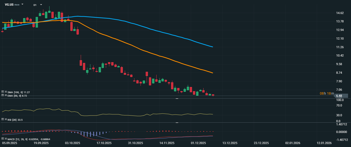 Akcie spoločnosti Venture Global pokračujú v klesajúcom trende a aktuálne sa obchodujú na úrovni 6,48 USD, teda tesne nad historickým minimom. Technické indikátory potvrdzujú silné medvedie nastavenie trhu. Cena akcie sa dlhodobo drží pod oboma kĺzavými priemermi – EMA 50 (8,72 USD) a SMA 100 (11,27 USD), pričom oba vykazujú klesajúci trend. To signalizuje pokračujúcu stratu dôvery investorov a absenciu výraznejších nákupných impulzov. RSI dosahuje hodnotu 33,5, čo naznačuje prekúpenosť, no zatiaľ bez náznakov obratu trendu. Rovnako MACD zostáva hlboko pod signálnou líniou, a histogram ďalej ukazuje negatívne momentum.