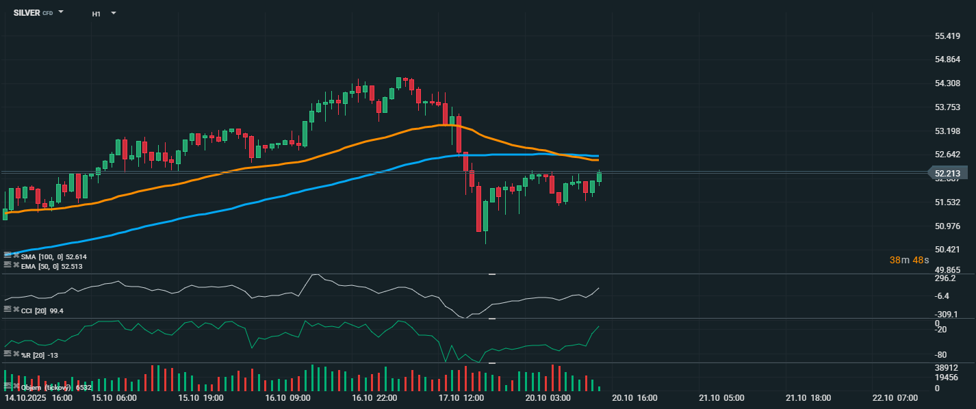 Cena striebra sa na hodinovom grafe pokúsila stabilizovať po prudkom výpredaji, ktorý nasledoval po dosiahnutí historických maxím. Aktuálne sa obchoduje okolo 52,21 USD za uncu, pričom sa trh snaží preraziť späť nad kĺzavé priemery EMA 50 (52,51 USD) a SMA 100 (52,61 USD). Tieto úrovne momentálne slúžia ako kľúčová technická rezistencia.