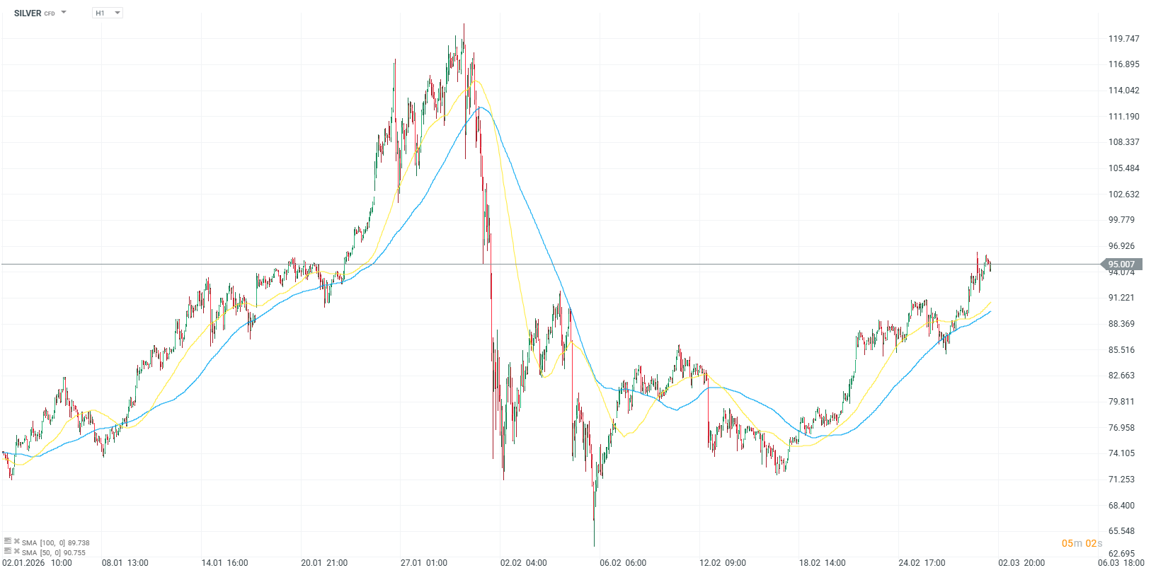 Striebro od začiatku roka posilnilo o viac ako 30 %, pričom k jeho rastu prispievajú aktuálne geopolitické udalosti. Cena sa v súčasnosti pohybuje okolo 95 USD za uncu.
