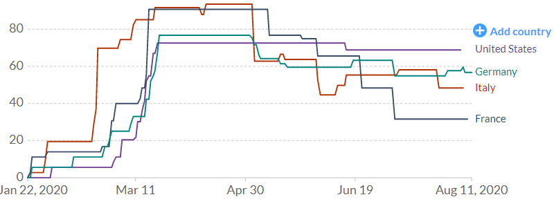 Oxfordská univerzita začala pred niekoľkými mesiacmi zverejňovať tzv. „stringency index“, ktorý meria úroveň blokovacích opatrení v jednotlivých krajinách. Pomocou vývoja tohto indexu môžeme zistiť, aké prísne blokovacie opatrenia sú zavedené v jednotlivých krajinách a môžeme sledovať ich vývoj.