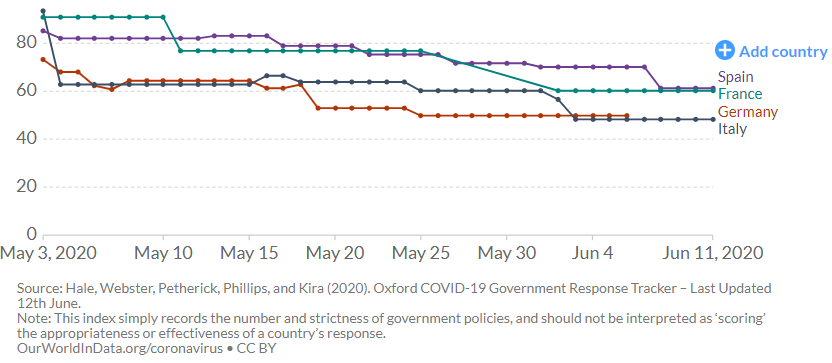 Oxfordská univerzita začala pred niekoľkými mesiacmi zverejňovať tzv. „stringency index“, ktorý meria úroveň blokovacích opatrení v jednotlivých krajinách. Pomocou vývoja tohto indexu môžeme zistiť, aké prísne blokovacie opatrenia sú zavedené v jednotlivých krajinách a môžeme sledovať ich vývoj.