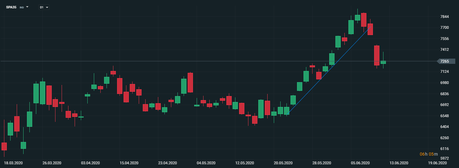 Na vyššie uvedenom grafe si môžeme všimnúť, že španielsky akciový index (SPA35) má za sebou pomerne slušnú rally, no v posledných dňoch index zaznamenal pokles, pretože sa objavili obavy z druhej vlny nákazy v USA, čo viedlo ku zhoršeniu sentimentu na trhoch. Zdroj: xStation5