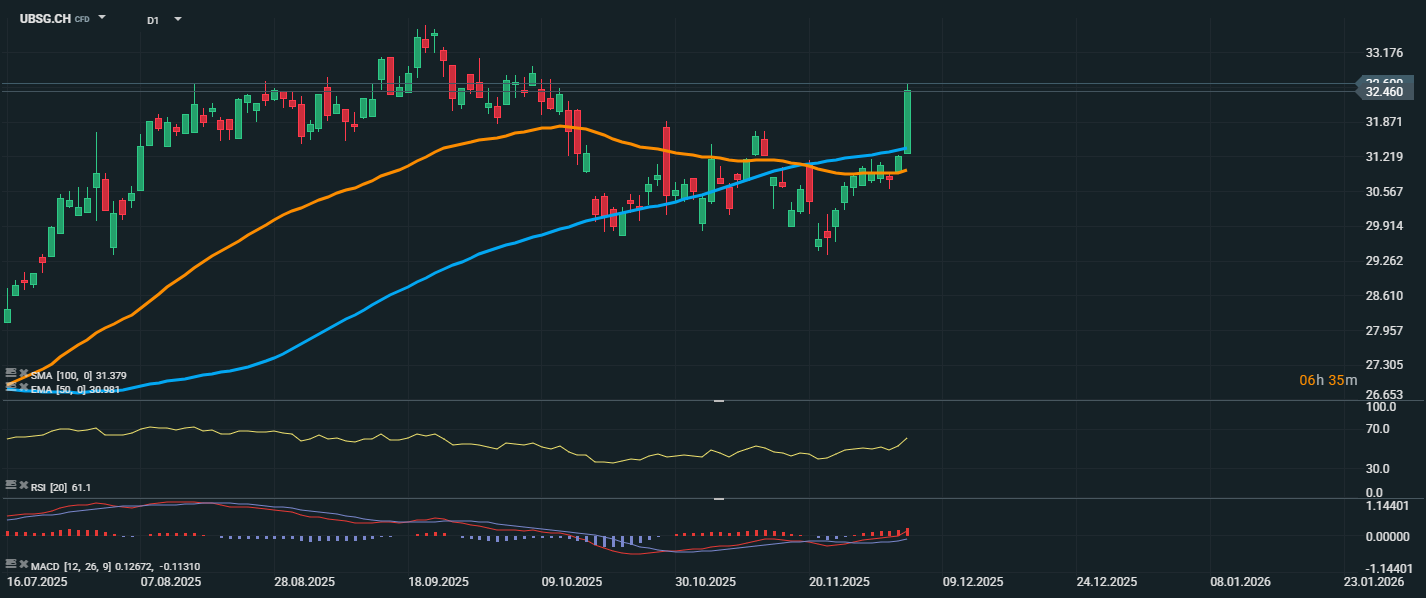 Akcie švajčiarskej banky UBS dnes zaznamenali výrazný rast a uzavreli na úrovni 32,46 CHF, čím prudko prerazili nad kľúčové kĺzavé priemery – EMA 50 (30,98 CHF) a SMA 100 (31,38 CHF). Akcie neprerazili len dlhodobé technické bariéry, ale zároveň sa odrazili od predchádzajúcej konsolidačnej štruktúry s výnimočne silnou rastovou sviečkou. RSI sa aktuálne nachádza na úrovni 61,1, čo naznačuje silný nákupný moment, no stále bez známok prekúpenosti.