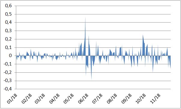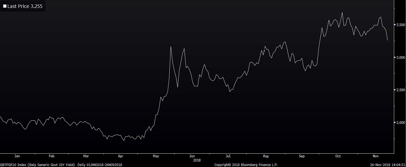 Aktuálne asi najmocnejší človek v Taliansku – vicepremiér Salvini, dnes vyhlásil, že ohlásený deficit na úrovni 2,4% sa môže zmeniť. Podľa niektorých „insider“ zdrojov by mohol byť v záujme zachovania pokoja (a nižších nákladov na obsluhu dlhu) znížený na 2%. To malo pozitívny dopad na výnosy z talianskych dlhopisov. Pri desaťročných splatnostiach klesli pod 3,3%. Stalo sa to po prvýkrát od prelomu septembra a októbra, kedy vláda ohlásila ukončenie konsolidácie.