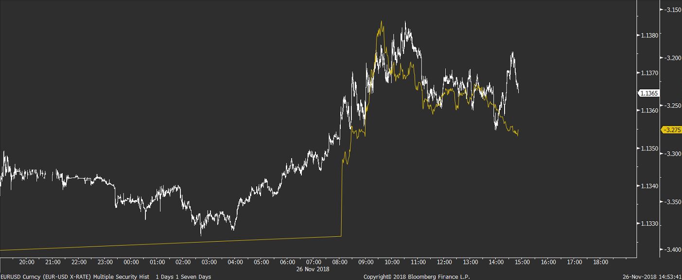 Dnešný vývoj EURUSD a výnosov z 10-ročných talianskych dlhopisov (inverzne).