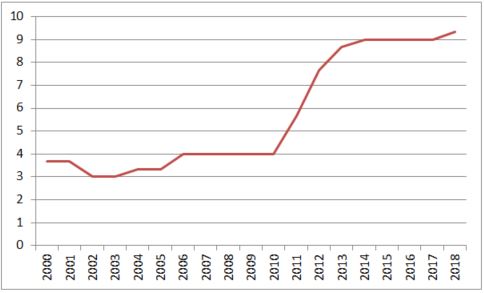 Priemerný rating pre Taliansko od veľkej trojky (AAA=1; BBB- = 10)