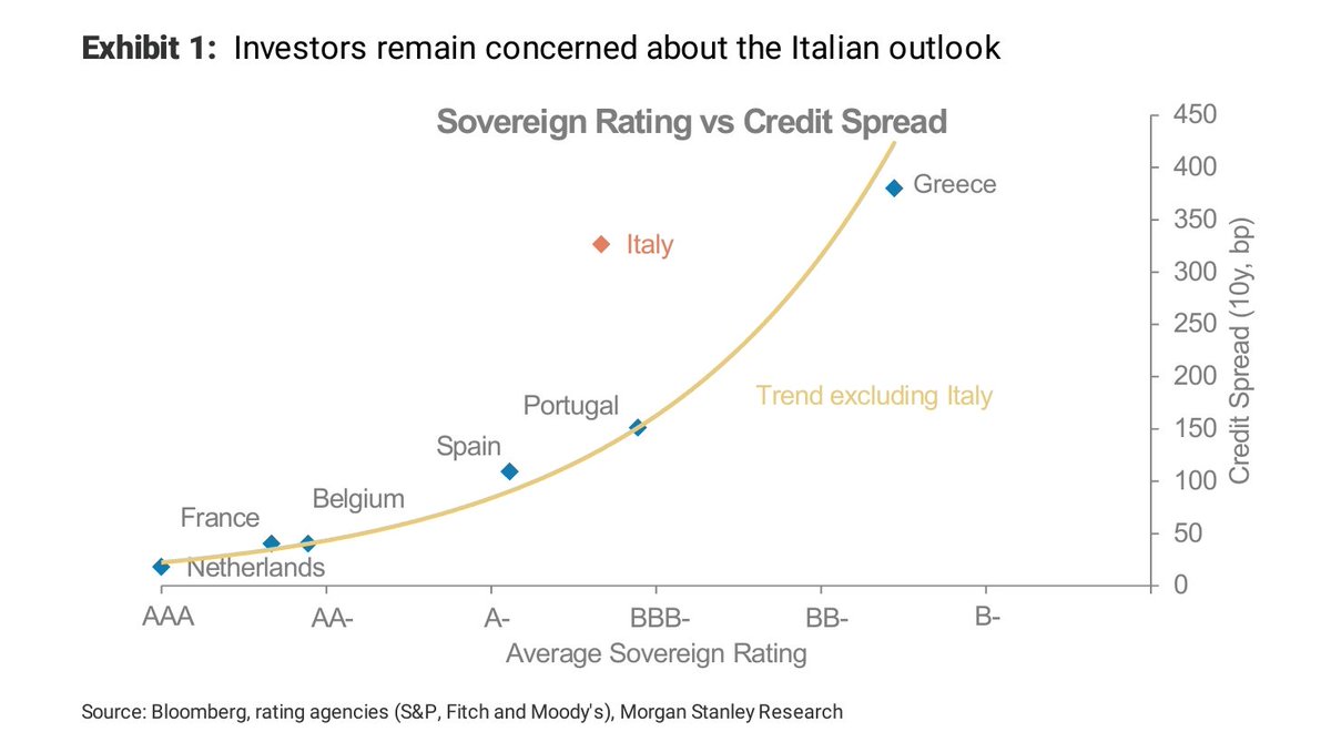 Aktuálne je priemerný rating Talianska od troch veľkých agentúr na úrovni 9,33 (1 je AAA, 11 je BB+, t.j. mimo investičného pásme). Pokiaľ sa dostane nad 10,5, tak nastane ten problém, o ktorom som písal vyššie.