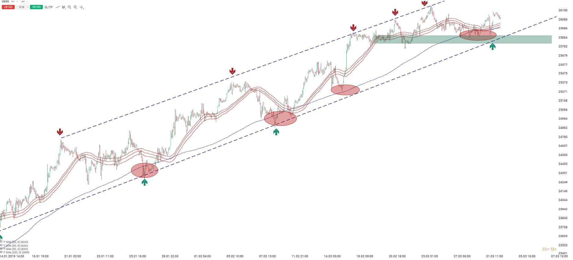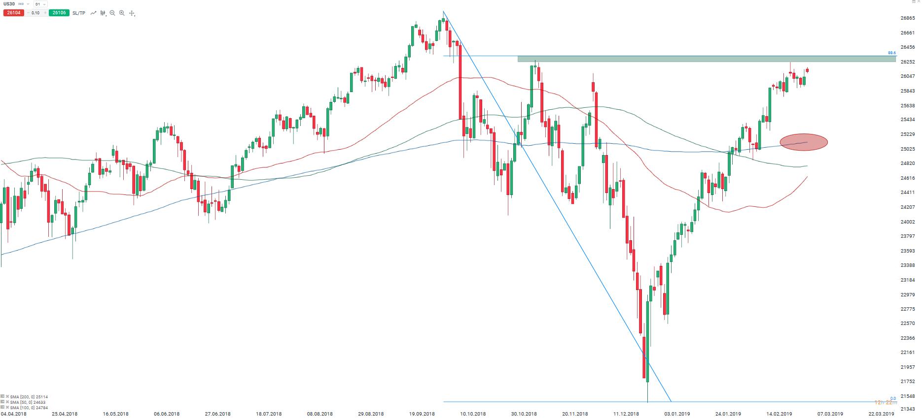 Z krátkodobého pohledu se Dow Jones obchoduje v rostoucím trendovém kanálu. Je třeba zdůraznit, že od počátku roku 2019 se obchoduje nad 200 hodinovým klouzavým průměrem a dosud každý test této překážky skončil pro index pozitivně (červené kruhy). Zóna rezistence na denním grafu (26 250-26 350 bodů) je v současnosti hlavní překážkou kupujících. Býky by na cestě vzhůru měl podpořit zmíněný 200 hodinový průměr, který je první důležitou úrovní supportu.
