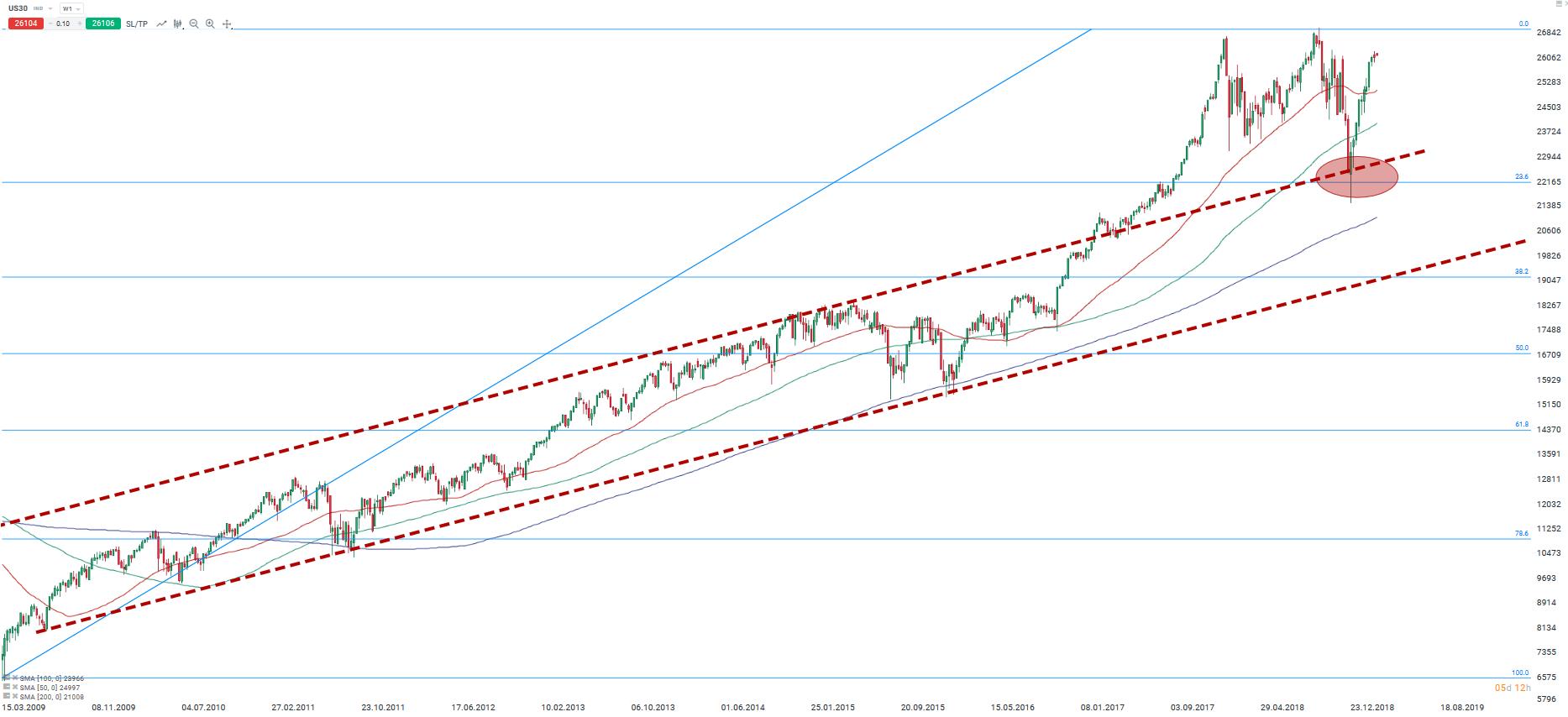 Pokud se podíváme na denní graf, tak vidíme, že se Dow Jones obchoduje v dosahu důležité zóny rezistence mezi 26 250 - 26 350 body. V této zóně se nachází lokální maxima z listopadového obratu a 88,6 % Fibo úroveň celého pohybu na nižší hodnoty. Pokud bude tato zóna proražena, tak se nám otevře cesta k historickým maximům. Na druhou stranu musíme vnímat 200 denní klouzavý průměr, který hraje roli prvního významného supportu.