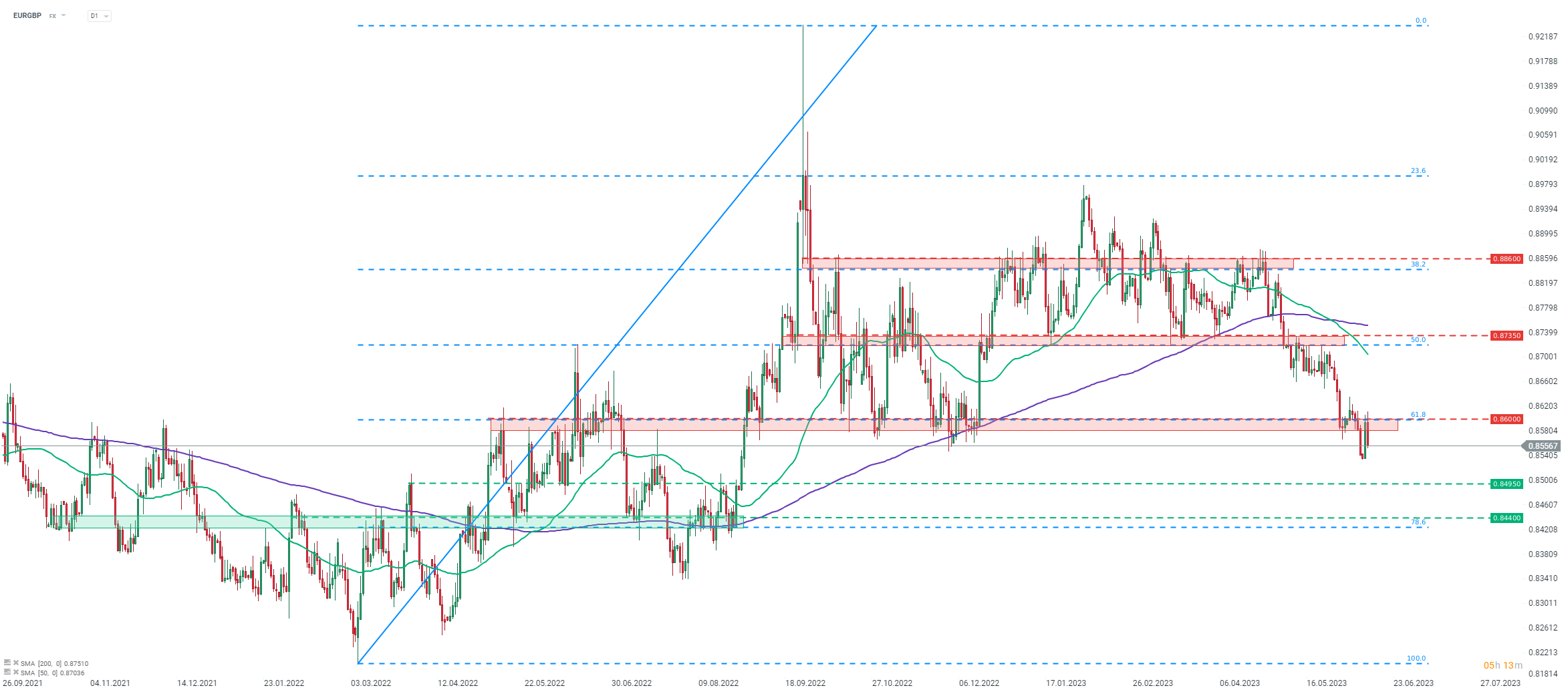 Podíváme-li se na graf EURGBP v intervalu D1, vidíme, že pár pokračuje v poklesu. Včera došlo k silnému pohybu vzhůru, ale kupcům se nepodařilo prorazit nad dříve proraženou cenovou zónu 0,8640, vyznačenou 61,8% retracementem vzestupného impulsu započatého na začátku roku 2022. Neproražení zpět nad tuto zónu potvrzuje, že klesající trend na tomto páru zůstává pevný. EURGBP se dnes po zveřejnění údajů o zaměstnanosti ponořil níže a téměř zcela vymazal včerejší zisky. Pokud se pokles v nadcházejících dnech dále prohloubí, budou sledovanou hladinou podpory dvě úrovně: swingová oblast 0,8495 a zóna 0,8440, vyznačená 78,6% retracementem a předchozími cenovými reakcemi.