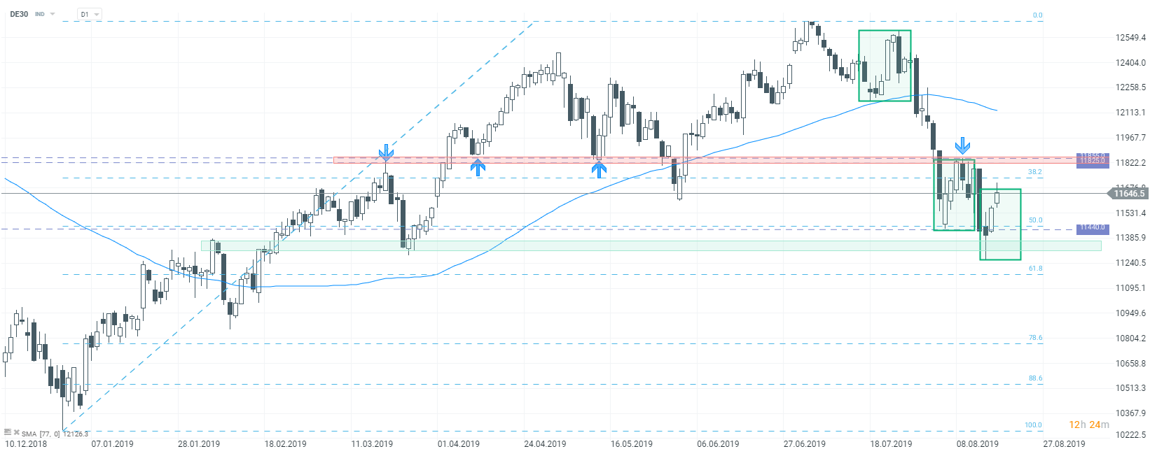 Německému akciovému indexu DAX se daří o mnoho hůře než indexům na Wall Street. DE30 je v klesajícím trendu už od začátku července. V čase přípravy této analýzy se opět obchoduje na úrovni horní limity struktury Overbalance, kterou můžeme považovat za rezistenci. Dle metodologie by mohla potenciální korekce stlačit cenu až k novým minimům. Nicméně pokud index dále poroste nad limity tržní geometrie, tak by obchodníci měli brát v úvahu rezistenci na 11 840 bodech. Až překonání této hladiny by index mohlo dostat ještě na vyšší hodnoty a zneplatnit probíhající klesající trend.