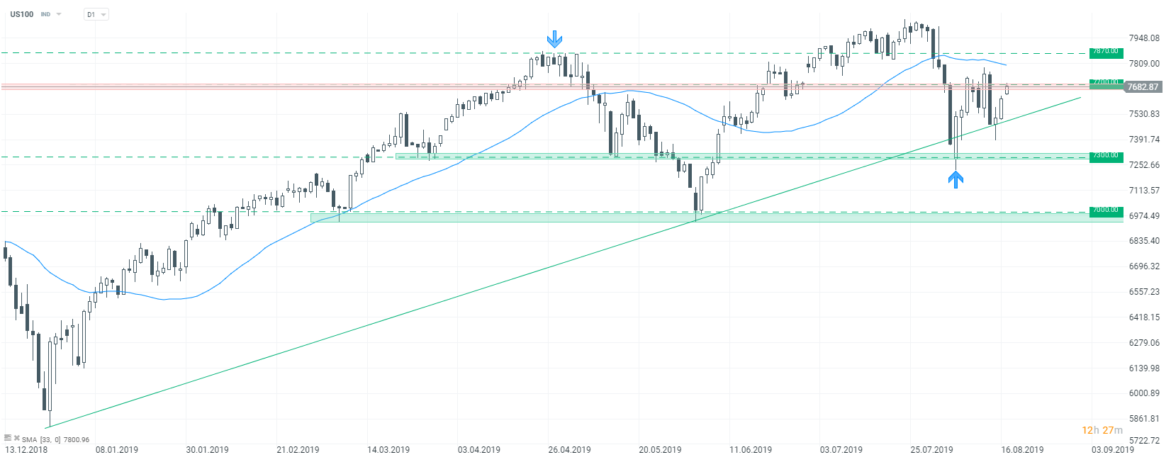 Z technického pohledu je zřetelné, že ani přes prudký propad neprorazil index USD rostoucí trendovou čáru. Ta se dvakrát projevila jako dobrý support. Ta hlavní podpora se však v současnosti nachází na 7300 bodech, kde jsme mohli 6. srpna vidět hezkou tržní reakci. Naopak rezistenci vnímáme v okolí 7800 bodů, kde se nachází 33období klouzavý průměr a předchozí maxima.