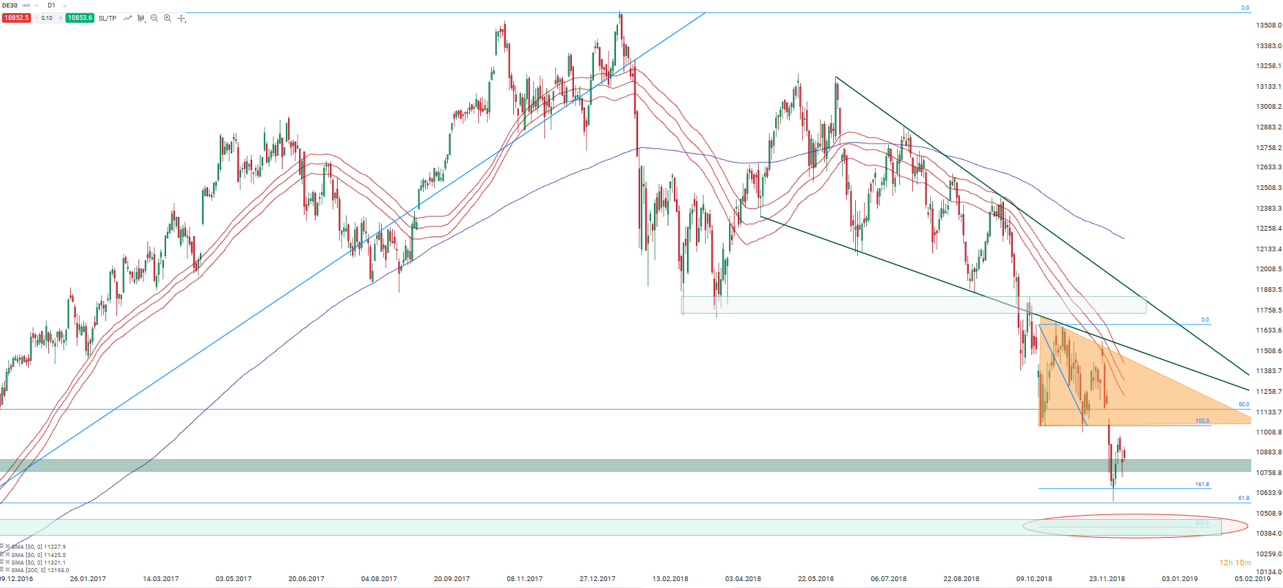 Situace vypadá zajímavě také při pohledu na denní graf. Německý index stále nenaplnil rozpětí klesajícího trojúhelníkového patternu. Pokud by se vyvíjel učebnicově, tak by se index měl dostat do blízkosti 10 400 bodů (červená elipsa na grafu níže). Nicméně ještě před dosažením této překážky by se prodejci museli poprat s již zmíněnou hladinou 61.8% Fibo úrovně, která medvědy odradila v minulém týdnu. V opačném směru se nabízí hladina 11 000 bodů jako nejbližší důležitá rezistence.