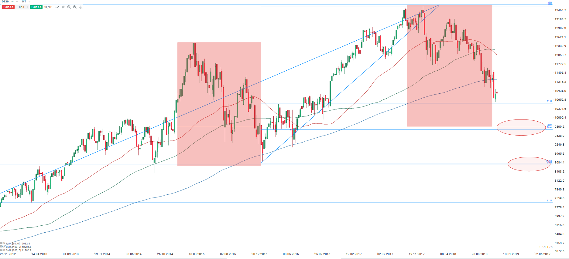 V minulém týdnu byla k vidění korekce na německých akciích. Předchozí propad byl zastaven v blízkosti úrovně 61,8 % Fibo retracementu růstového impulsu, který začal na počátku roku 2016. Nicméně pokud se na trh podíváme zeširoka, tak je zřejmé, že rozpětí korekce od roku 2015 (červené obdélníky na grafu níže) nebylo stále dosaženo. Pokud by se měla současná korekce vyrovnat té z roku 2015, tak by se DAX měl propadnout až na úroveň 9800 bodů. Na této úrovni bychom také nalezli úroveň 78.6% retracementu cenové vlny, které započala v roce 2016 a 38.2% Fibo úrovně býčího trhu s počátkem v roce 2009. Další stopkou pro medvědy by mohla být až důležitá hladina 8600 bodů, kde se nacházejí minima z konce roku 2016 a 50 % retracement desetiletého býčího trhu.