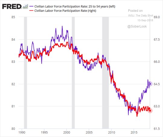 Niektorí argumentujú, že nízka miera nezamestnanosti je daná kolapsom participácie obyvateľstva na pracovnej sile (teda že ľudia prestali hľadať prácu) a tým pádom je ešte dostatok voľných zamestnancov, čo drží rast miest nižšie. To je však pravda len čiastočne, pretože značná časť poklesu participácie je daná tým, že silné ročníky odišli do dôchodku. Do 54 rokov participácia v posledných dvoch rokoch prudko rastie, čiže voľnej pracovnej sily ubúda aj podľa tohto ukazovateľa (@LizAnnSonders):