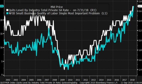 O sile trhu práve vypovedá percento výpovedí. To sa dostalo na novú najvyššiu úroveň od roku 2000 2,7%. Výpovede dávajú ľudia väčšinou v situácii, kedy majú lepšiu ponuku, alebo si myslia, že nájdu minimálne podobne dobrú ako je tá aktuálna. Percento výpovedí navyše silno koreluje s percentom malých firiem, ktoré hlási, že nedostatok pracovnej sily je ich najväčší problém. Aktuálny 25% je najviac v histórii časového radu, ktorá sa datuje až do prvej polovice 70-tych rokov (@TheStalwart):
