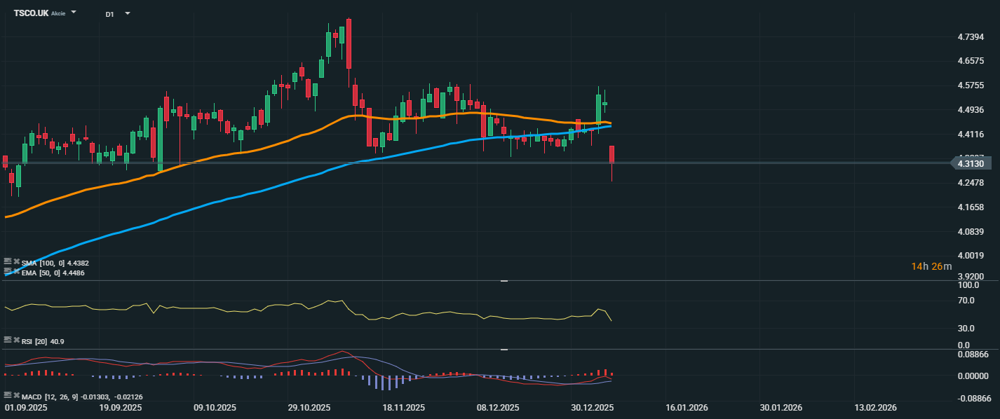 Cena akcií Tesco sa aktuálne pohybuje okolo 4,31 GBP, teda pod kĺzavými priemermi EMA 50 a SMA 100, ktoré ležia blízko úrovne 4,45 GBP. Technické indikátory potvrdzujú zhoršenie trhového sentimentu. RSI klesol na hodnotu 40,9, čo značí slabnúcu nákupnú silu, hoci trh ešte nevstúpil do prepredaného pásma. MACD sa preklápa do negatívneho teritória, čo potvrdzuje obrat momenta smerom nadol. Cena prerazila pod dôležitú úroveň podpory z predchádzajúcich konsolidačných dní a signalizuje možné pokračovanie korekcie. Najbližšia významná technická podpora sa teraz nachádza v oblasti 4,16–4,20 GBP, a jej udržanie bude kľúčové pre stabilizáciu trhu.