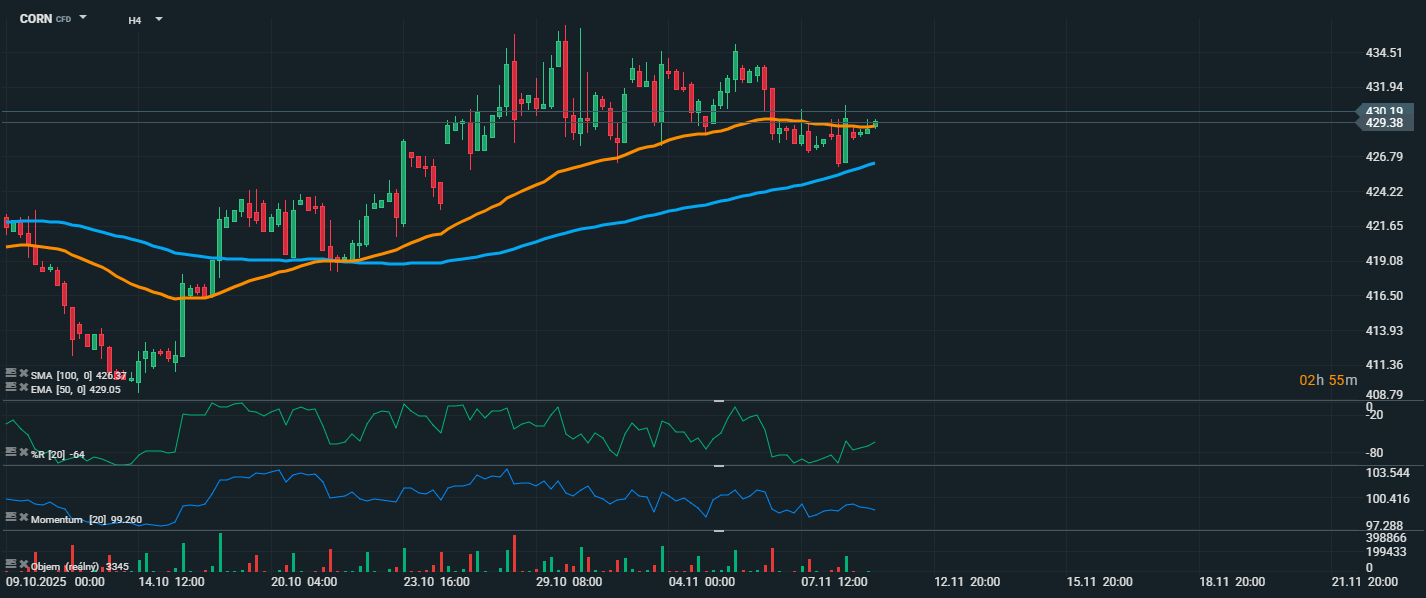 Cena kukurice sa obchoduje okolo úrovne 429,38 USD, teda nad kĺzavým priemerom EMA 50 (429,05 USD) a nad SMA 100 (426,82 USD). Táto technická konfigurácia môže signalizovať pokus trhu o návrat k rastu. Momentum dosahuje hodnotu 99,26, čo naznačuje silnejší nákupný tlak a možné oživenie býčieho trendu. Williams %R sa zlepšil z prepredaných úrovní a aktuálne sa pohybuje okolo -54, čo je stále neutrálna zóna, ale s potenciálom ďalšieho rastu. Objem obchodov zostáva priemerný, bez výrazných výkyvov, čo naznačuje vyčkávací prístup investorov po predchádzajúcom poklese, ktorý sa zastavil práve v okolí kĺzavých priemerov. Cena sa zároveň odrazila od EMA 50 aj SMA 100, ktoré predstavujú dôležité technické úrovne podpory, a krátkodobé sviečky naznačujú možný stabilizačný pohyb v bočnom trende.