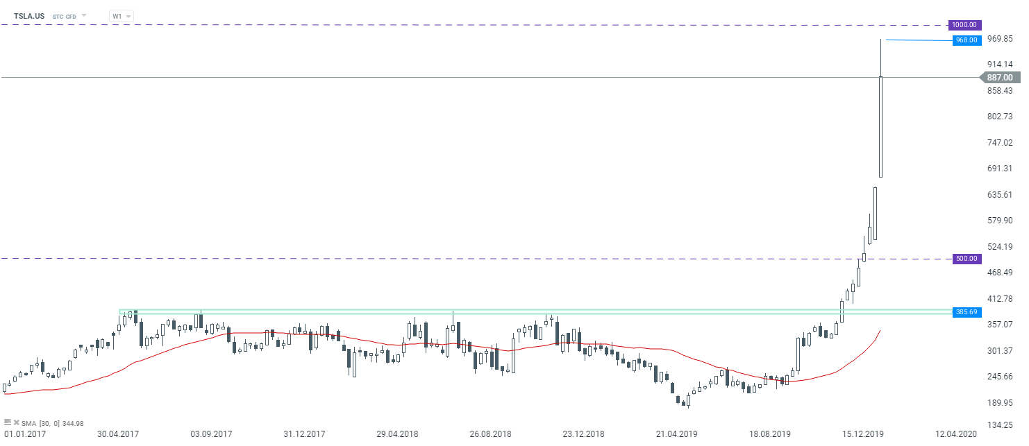 Akcie společnosti Tesla už v tomto roce zdvojnásobily svoji hodnotu. Akcie skončila včerejší seanci na úrovni 887 dolarů po neúspěšném intradenním útoku na úroveň 1000 dolarů. Mnoho investorů říká, že růst ceny není důsledkem fundamentů, nicméně jen velmi málo z nich si je ochotno proti růstu vsadit. Tesla se nyní pohybuje v nezmapovaném teritoriu prostém důležitých technických úrovní. Je otázkou, kdy toto růstové šílenství skončí. Psychologická úroveň 1000 dolarů by mohla zafungovat a zůstává tou nejdůležitější úrovní v dosahu. Tradeři by za současného "hype" měli být opatrní v otevírání sell pozic, protože než by se "pravda" mohla ukázat, tak spousta z nich by už nemusela být solventní. Na každý pád jen skutečně silný prodejní signál by mohl medvědy aktivovat a opatrnost je na místě.