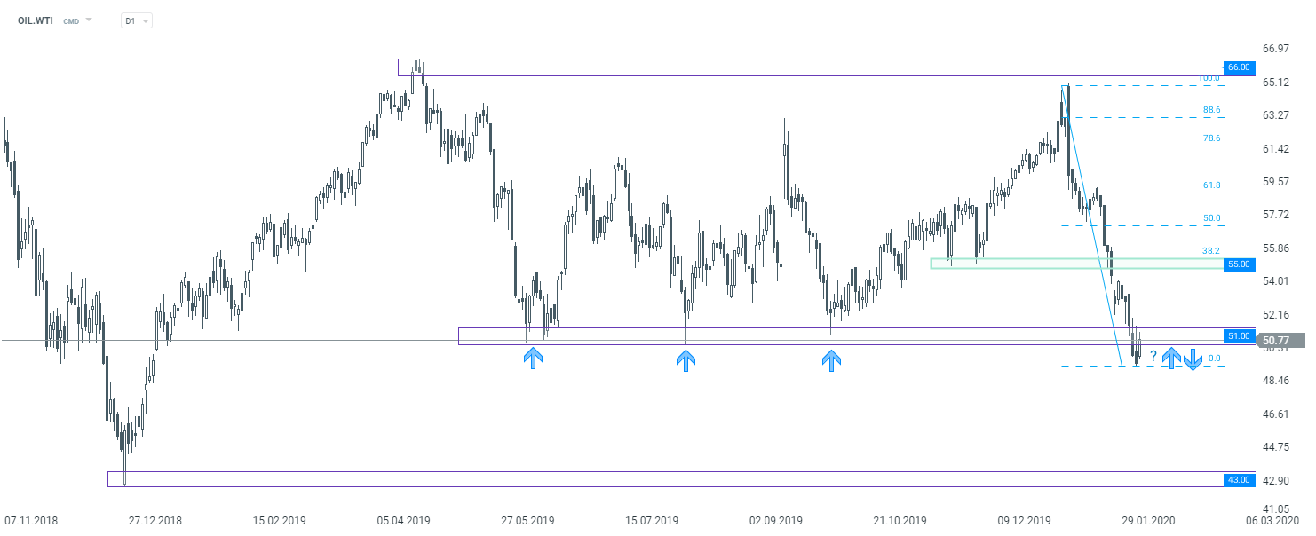 Technická situace na ropě WTI (OIL.WTI) je také velmi zajímavá, i když v tomto případě se instrument vydal na jih. Cena ropy dosáhla na nová roční minima, když se dostala až pod úroveň 50 dolarů. Dnes své největší ztráty koriguje a dostala se nad rezistenci 51 dolarů. Pokud se udrží nad touto hladinou, tak by mohla pokračovat pozitivní korekce. Není vyloučen rychlý vzestup až k úrovni zóny rezistence na 55 dolarech za barel.