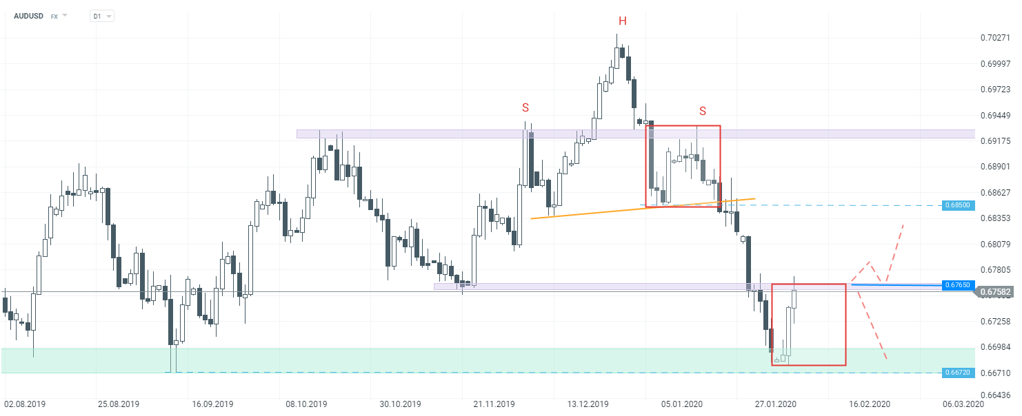Pár se dokázal vzpamatovat z poklesu po zasedání australské centrální banky RBA a odrazil se od důležité zóny supportu definované minimy minulého roku. Pozitivní korekce dosáhla rezistence na úrovni 0,6765 AUDUSD, která se zdá být v současnosti klíčovou hladinou. Další vývoj bude záviset na tom, zda se páru podaří prorazit, nebo se od této překážky odrazí zpět. Rezistence je definována minimy z listopadu 2019 a horní limitou struktury Overbalance. Dle metodologie platí, že pokud zůstane cena pod touto úrovní, tak hlavní trend zůstáne klesající.