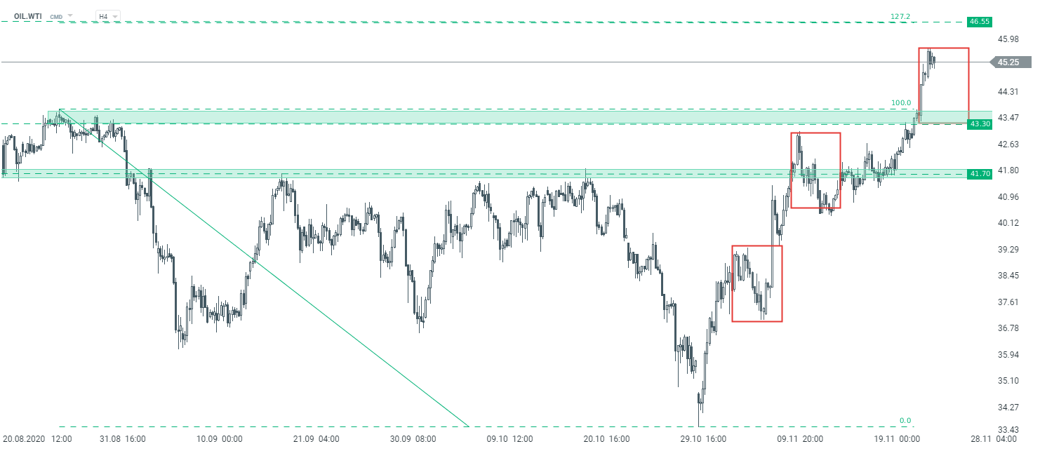 Trh s ropou nabral v posledních seancích jasně rostoucí trend. Cena ropy WTI (OIL.WTI) prorazila nad hlavní rezistenci definovanou postpandemickými maximy v blízkosti 43 dolarů. Pokud současný sentiment setrvá, tak můžeme očekávat pokračování růstového trendu až k rezistenci na 46,55 dolary, kde se nachází externí Fibo retracement (127,2 %). Pokud budeme naopak svědky negativní korekce, tak nejbližším supportem jsou úrovně v blízkosti již zmíněné hladiny 43 dolarů, která je zároveň spodní limitou struktury 1:1.