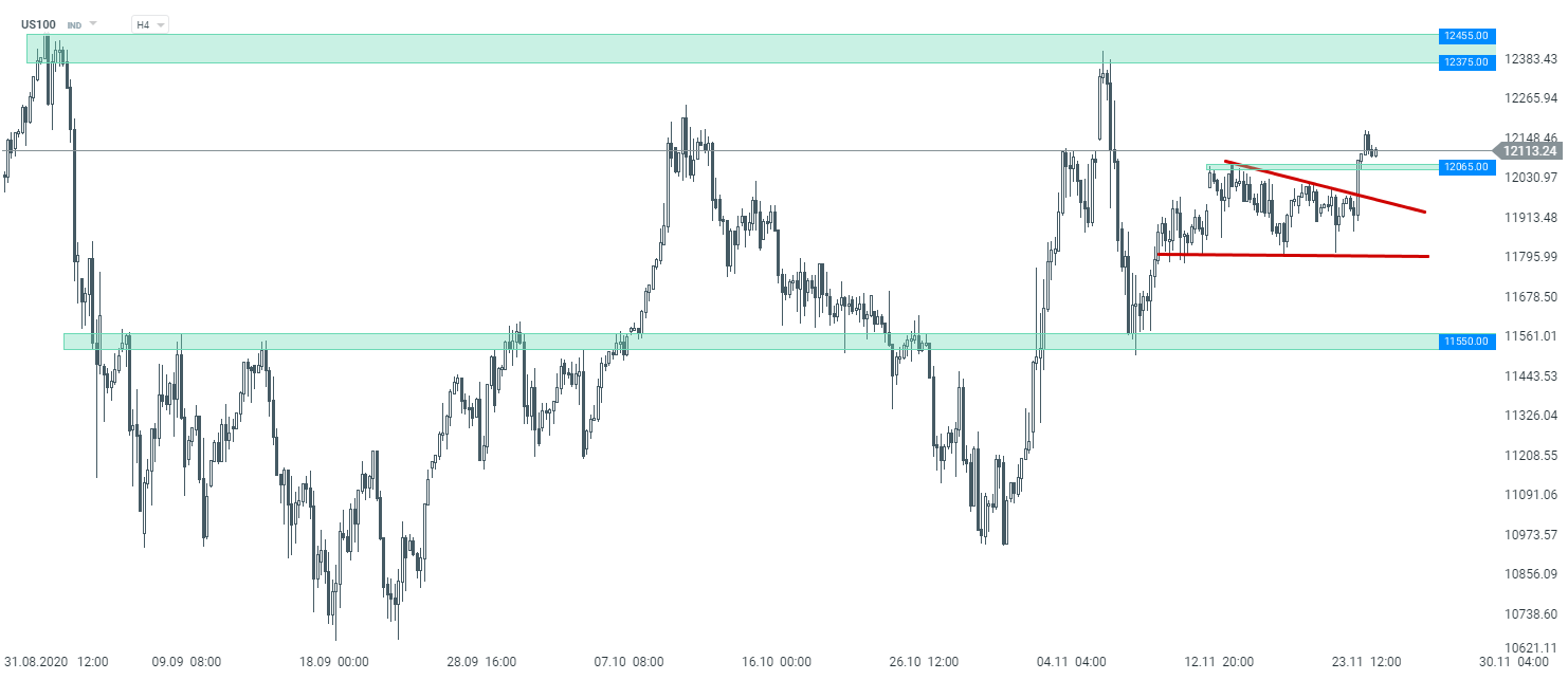 Začněme dnešní analýzu technologickým indexem Nasdaq (US100). Z pohledu technologické analýzy je zřetelné, že cena prorazila nad úroveň lokální konsolidační zóny, což by mohlo signalizovat obnovení rostoucího trendu. Dle standardního pohledu technické analýzy platí, že pokud se cena udrží nad úrovní supportu na 12 065 bodech, tak základním scénářem je pokračování rostoucího trendu k historickým rekordům. Pokud se naopak nastartuje klesající korekce, tak nejbližším klíčovým supportem je úroveň 11 550 bodů.