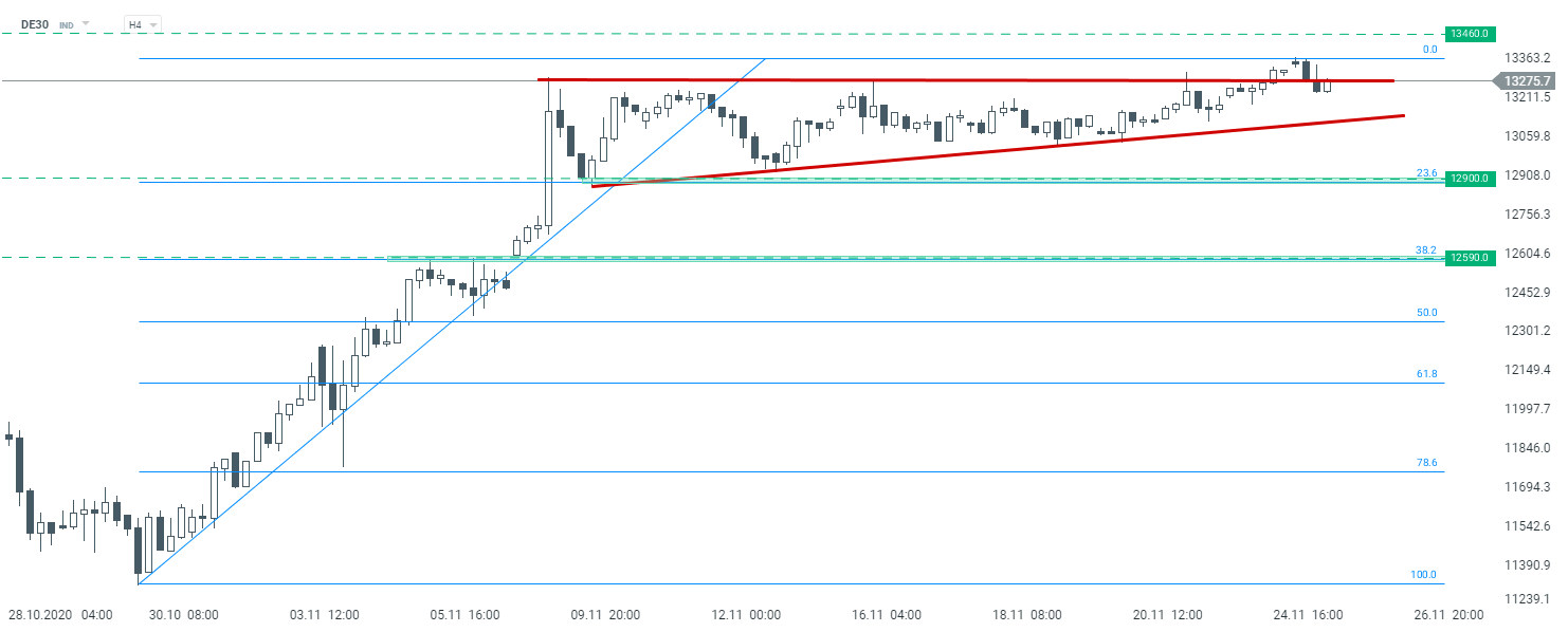 Německý trh rostl ruku v ruce s dalšími důležitými akciovými indexy v poslední době. Momentum však v posledních seancích výrazně zpomalilo. Při pohledu na H4 interval je zřetelné, že se indexu nepodařilo probít nad úroveň lokální konsolidační struktury. To by mohlo signalizovat, že index čeká korekce. Pokud cena prorazí pod spodní limitu trojúhelníkové formace označené červenou barvou, tak mohou poklesy akcelerovat. V případě tohoto scénáře by mohla být úroveň 12 900 bodů první cílovou cenou medvědů.