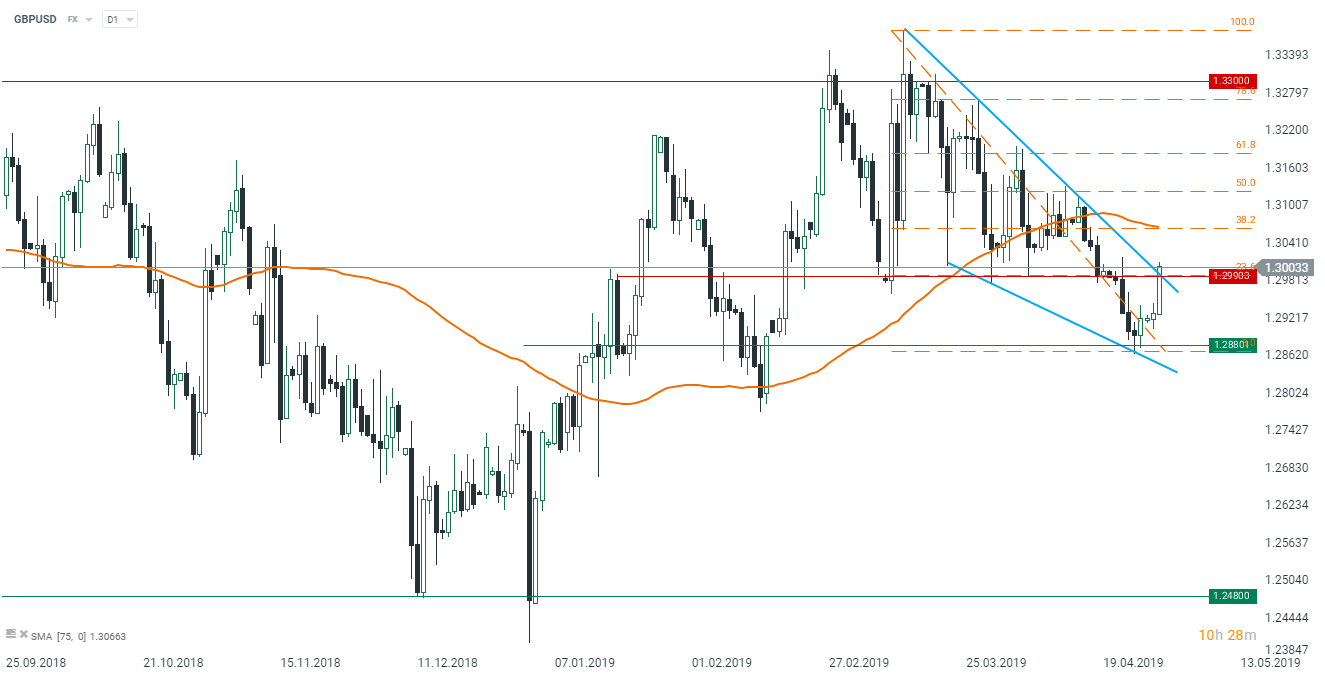 Ve čtvrtek zasedá Bank of England. Přestože se nečeká žádný pohyb sazeb, tak by si banka mohla ponechat jestřábí přístup k dalšímu vývoji měnové politiky. Takový scénář by byl ovšem podřízen hladkému vystoupení Velké Británie z EU (Brexit byl zatím odložen do konce října). Pár GBPUSD se nyní blíží úrovni nad klesajícím trojúhelníkem, ve kterém se v poslední době pohyboval. Tato oblast je také v souladu s důležitou technickou rezistencí na úrovni 1,2990. Pokud se páru podaří dále růst, mohli bychom se v brzké době dočkat až úrovně 50 % Fibo retracementu posledního poklesu. Svoji roli by však ještě předtím mohla hrát úroveň 75 DMA.