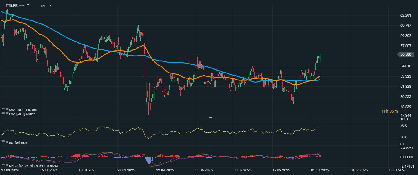 Akcie spoločnosti TotalEnergies zaznamenali výrazný rastový obrat, keď počas posledných týždňov prudko posilnili a aktuálne sa obchodujú na úrovni 56,58 EUR. Tento rast predstavuje prielom nad obe kľúčové technické úrovne – EMA 50 (53,39 EUR) a SMA 100 (52,86 EUR), čo je jasný signál zmeny trendu smerom nahor. RSI na úrovni 66,5 potvrdzuje silné nákupné momentum, pričom sa akcie blížia do pásma prekúpenosti. MACD taktiež generuje býčí signál, keďže hlavná línia je nad signálnou a histogram posilňuje, čo podporuje pokračovanie rastového trendu.