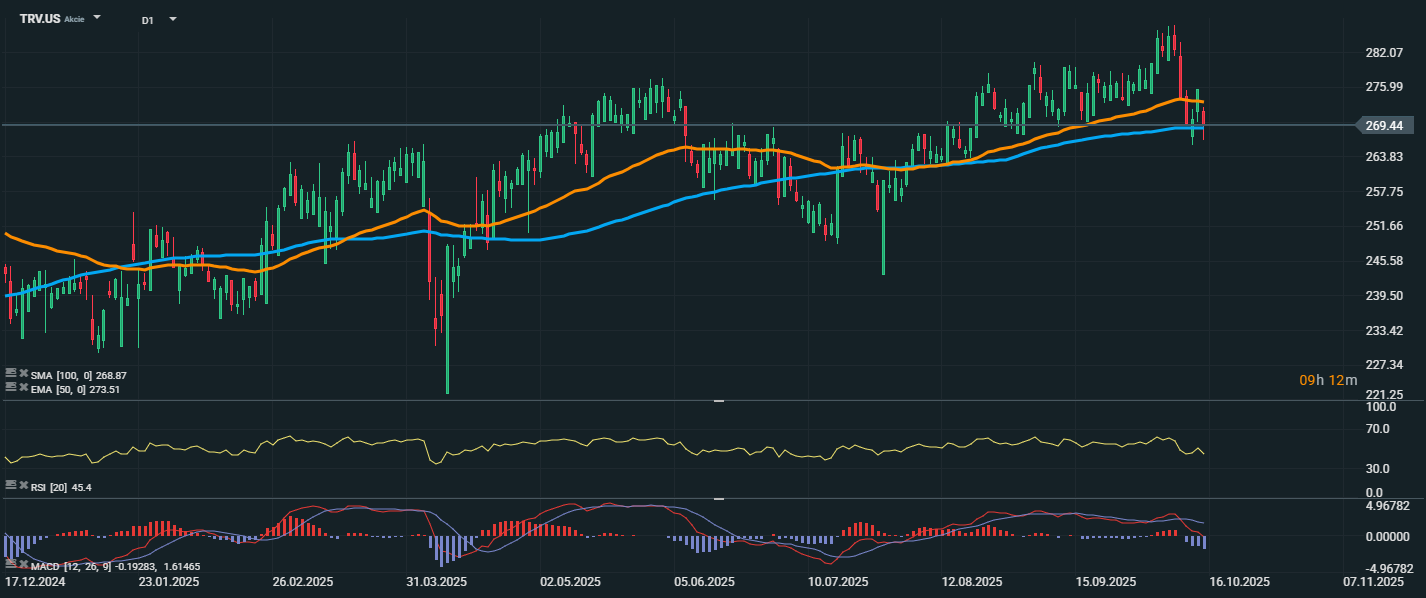 Akcie Travelers sa aktuálne obchodujú na úrovni 269,44 USD. Cena prelomila pod EMA 50 (273,51 USD) a testuje support v podobe SMA 100 (268,87 USD). RSI klesol na hodnotu 45,4, čo naznačuje slabnúce momentum, ale stále v neutrálnom pásme. MACD vytvoril negatívne prekrižovanie pod nulovou líniou a histogram sa prehlbuje, čo potvrdzuje zosilňujúci predajný tlak.
