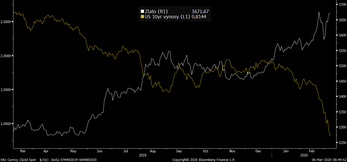 Zlato výrazně těží z kolapsu na dluhopisových výnosech. Zdroj: Bloomberg