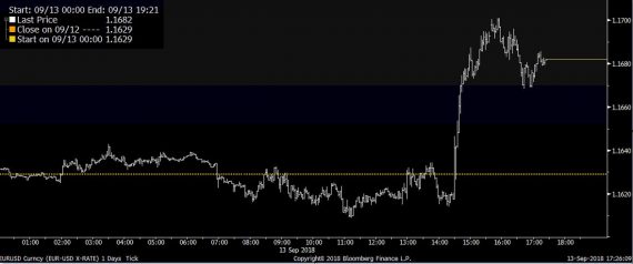 Euro na to reagovalo pozitívne (hoci podľa mňa to až také jastrabie nebolo) a je najsilnejšou menou dnešného obchodovania. EURUSD vyskočil z úrovní tesne nad 1,16 až k 1,17.